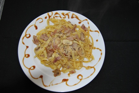 Pasta with bacon or ham, mushrooms, cream and blue cheese